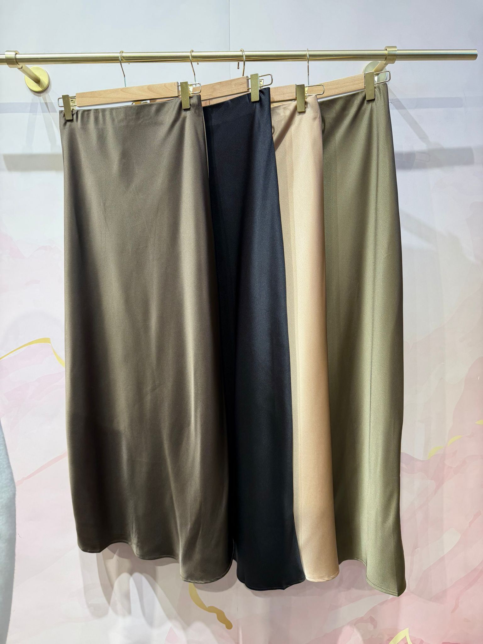 Colgado de izquierda a derecha: Chocolate-negro-beige-verde militar